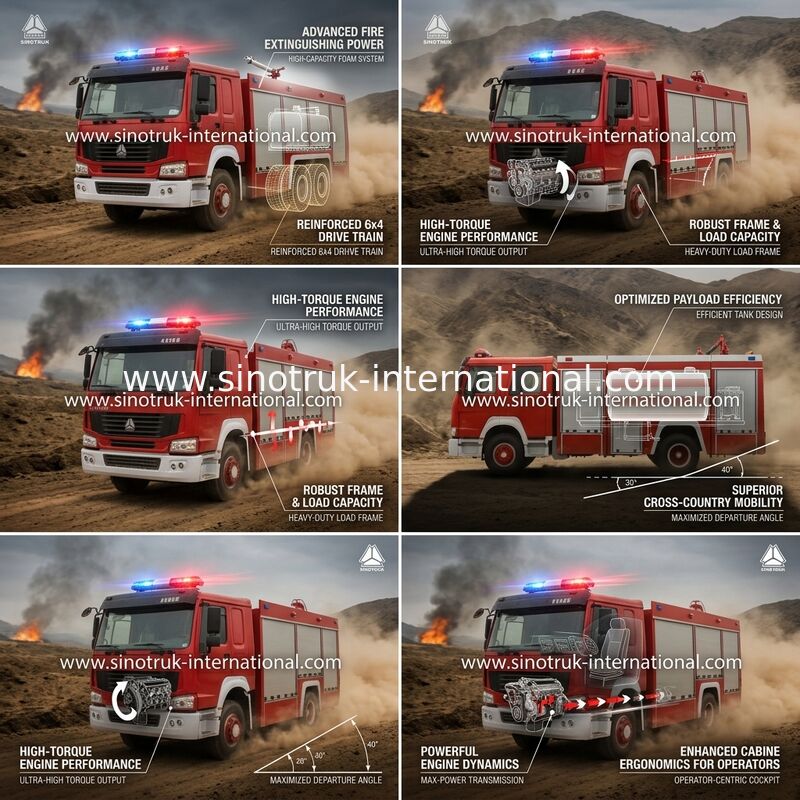 1) SINOTRUK Fire Fighting Truck have strong power, short acceleration time, compact structure, occupant space, low floor, convenient to staff on and off.